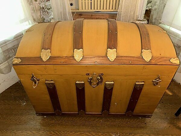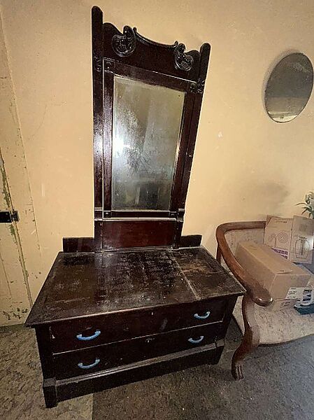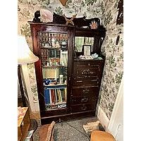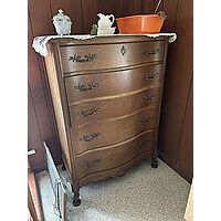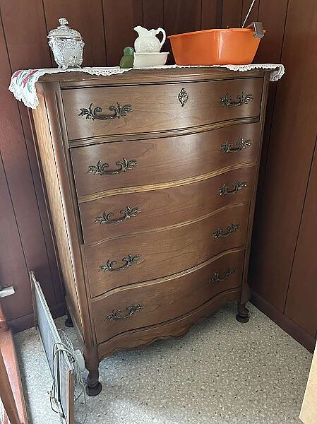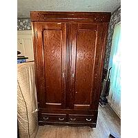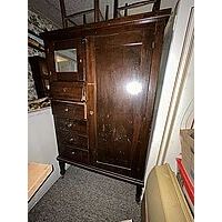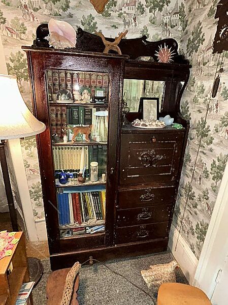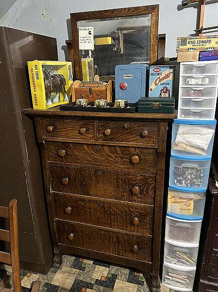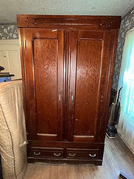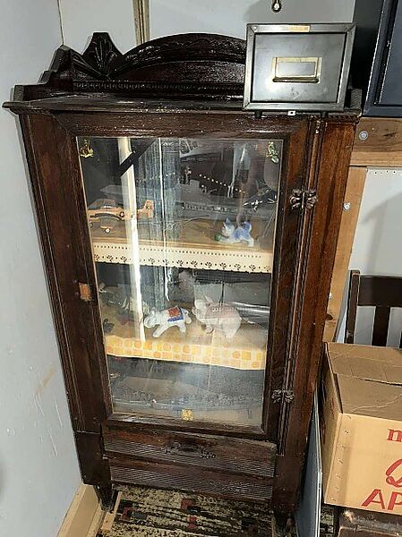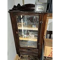 FURNITURE: Secretary Hutch; Oak Chest of Drawers x2; White Kitchen Cupboard; Oak Dresser; Antique Display Cabinet; Western Metal Trash Can; Antique Shelf; Walnut Chest; Oak Cabinet; Oak Wardrobe; White LG Refrigerator; Hercules Crate; Raytheon TV; Philco TV; Bedroom Set (Dresser, Twin Bed, Chest of Drawers, & End Tables); Gun Cabinet; Antique Clock; Inlay Table; Christian Becker Scale; The Cary Safe Co Safe; Thomas Collector Radio BD-100; Organ Stool x2; Humpback Trunk; Macey Stackable Book Case 5-Tier; Antique Sideboard Secretary; Allegro Zenith Sound System; Metal Cabinet; Kitchenette Table & Chairs; Oak Couch; Oak Buffet; Metal Hand Dolly; Vintage Buffet;