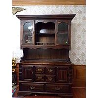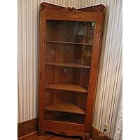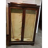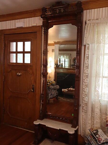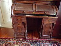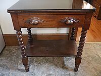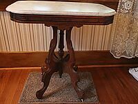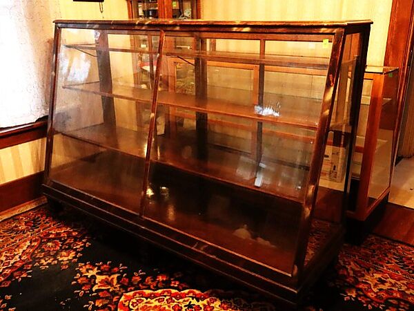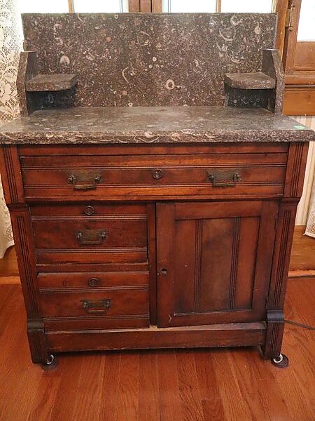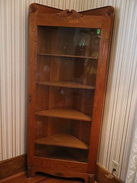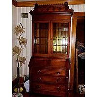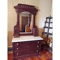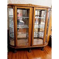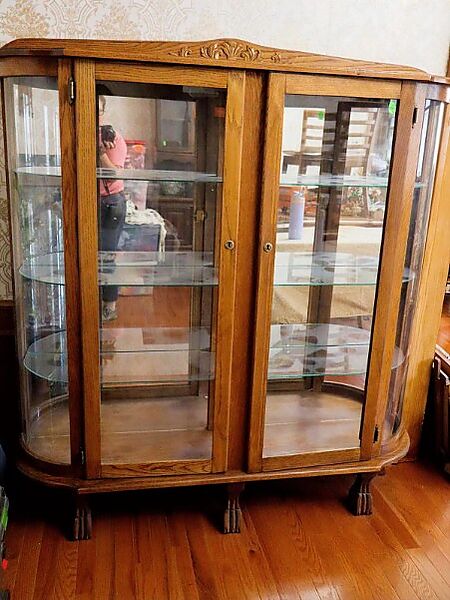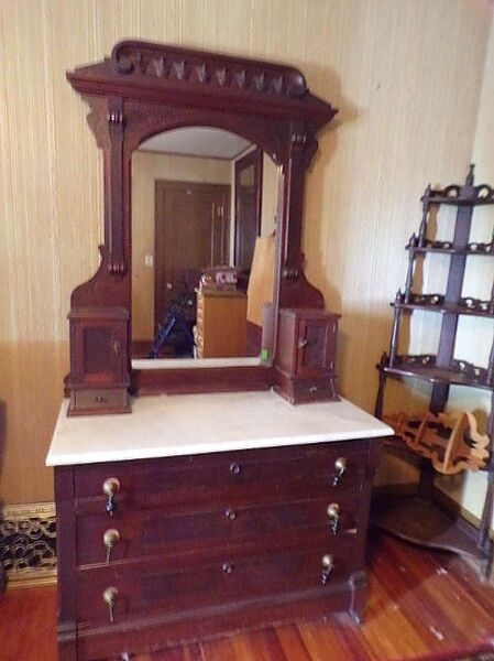 FURNITURE: Vintage hall tree with marble; vintage drop front secretary desk, curved glass curio cabinet; vintage washstand w/brown marble top & back splash; glider rocker, accent chairs; couch and matching loveseat; 2-TV screens; tables-some kitchen tables w/chairs; vintage lamps; roll top desk; bed frame; Antique dresser with mirror & marble top; 3 glass display cases; a couple of hutches;