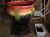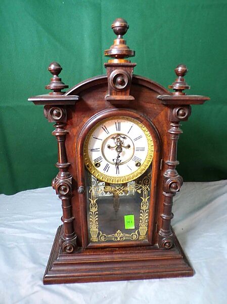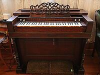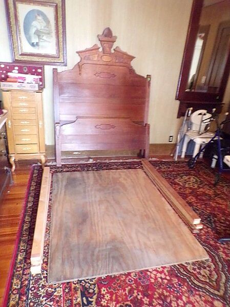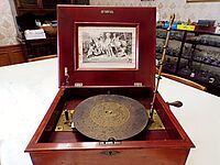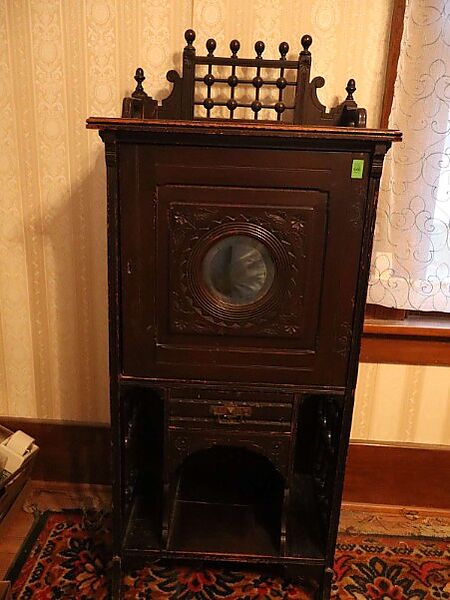 ANTIQUES: Melodeon/pump organ; Pine dough box; Schutz-Marke Symphonion Music Box w/ extra metal music box discs; Jacapi Mermaid family decoration-heavy, 21” L x 12" T; Antique 1950"s mantle clock with key-Seth Thomas Clock company, 8-hour strike; Antique 1940's salesman size Grand piano, plays; 2 antique trunks; Antique wicker back rocking chair, Antique quilt; Antique wooden child’s bed with mattress;