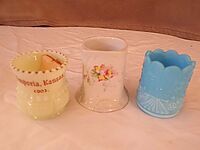 GLASSWARE/CHILDRENS GLASSWARE: Carnival glass; milk glass; Glass Books from Marion Hartung & Ione Hinshaw like Pattens & pinafores-pressed glass toy dishes for children; many pieces of clear glass: salt dips, drinking glasses; some items tagged, wonderful collection! Take a look!