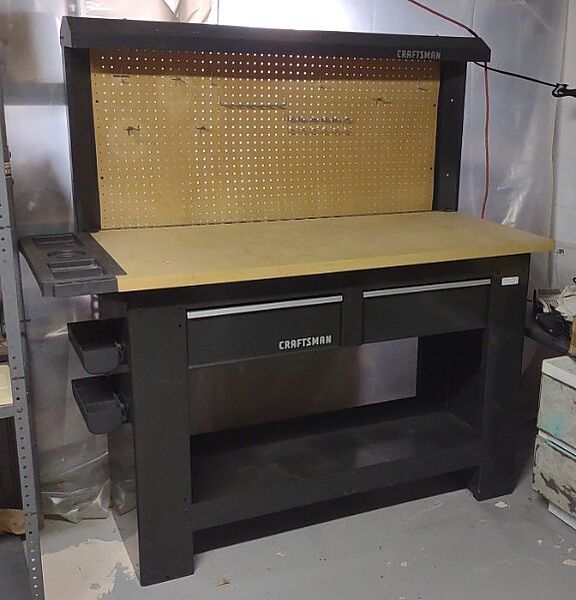 Metal workbench featuring 2 drawers and pegboard. VERY HEAVY & LARGE, PLEASE BRING HELP TO LOAD.
