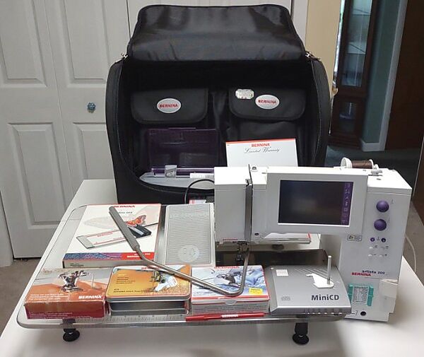 Includes Bernina travel case w/ retractable handle and wheels, Bernina MiniCd reader, Bernina modem, foot pedal, Bernina feet,...
