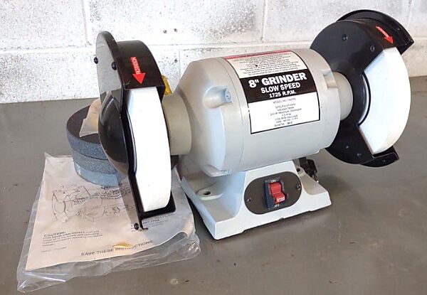 8 inch slow speed bench grinder tool. Model #144290. 1725 RPM. Tested and works. Includes 3 extra wheels.