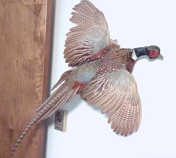 Flying taxidermy wall mount of flying mallard duck with wings spread.