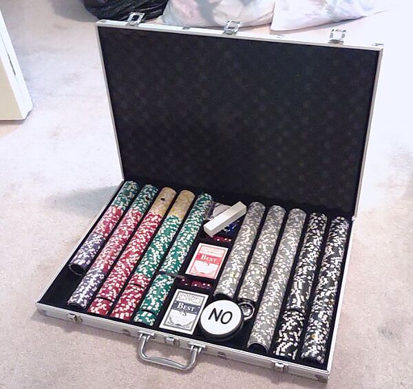Large poker chip game set in aluminum carry case. Missing a few chip bundles.