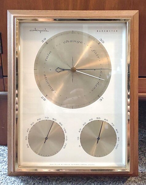Vintage mid century airguide weather station wall barometer. Features barometer, thermometer, and humidity gauge.