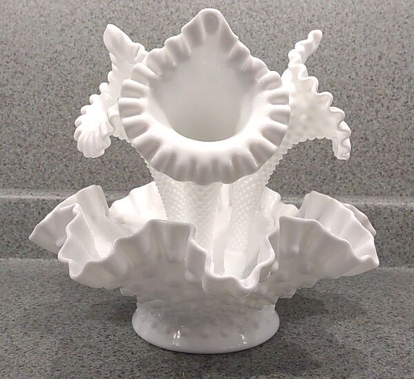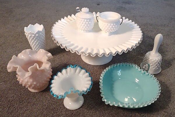 group of 8 Fenton art glass vases and serving pieces. Includes hobnail and silver crest.