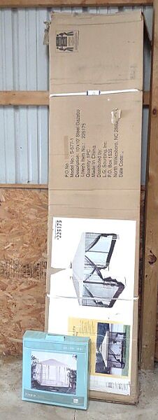 New in box Garden treasures beige 10' x 10' steel outdoor gazebo tent with additional Mosquito Net. LARGE & HEAVY, PLEASE BRING...