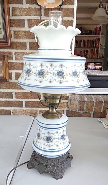 Vintage 1973 Quoizel Abigail Adams blue floral Hurricane Lamp. Tested and works.