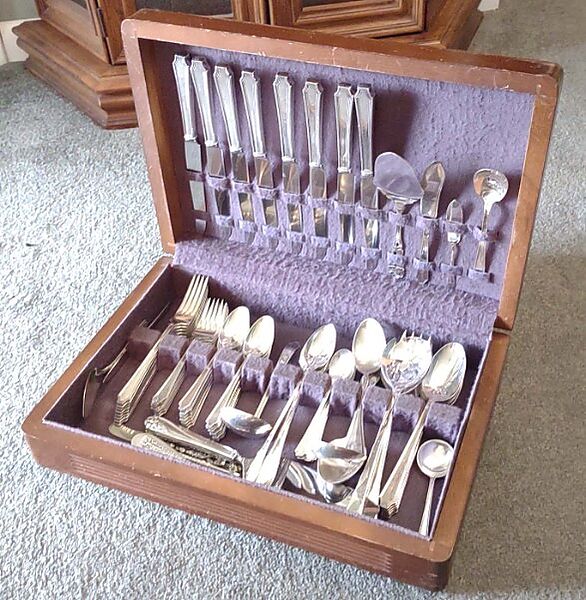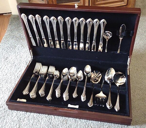 Oneida Distinction Deluxe Stainless Flatware Set in Wallace wooden box.