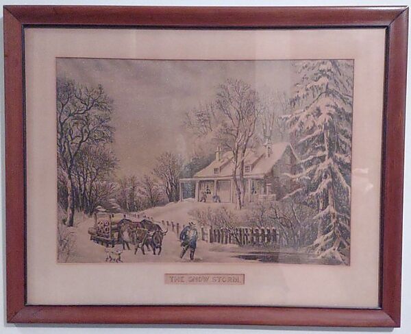 Currier & Ives "The Snow Storm" Lithograph in glass front frame.