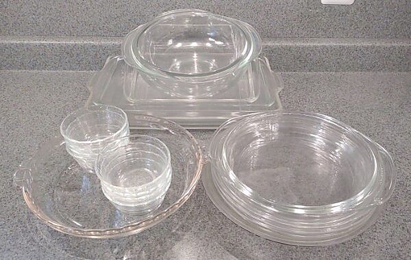 A large lot of vintage Pyrex clear baking and serving bowls. All are Pyrex, and are marked.