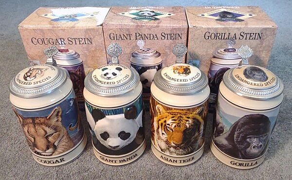 Four vintage budweiser endangered species beer stein set with 3 boxes. Tiger is missing box.