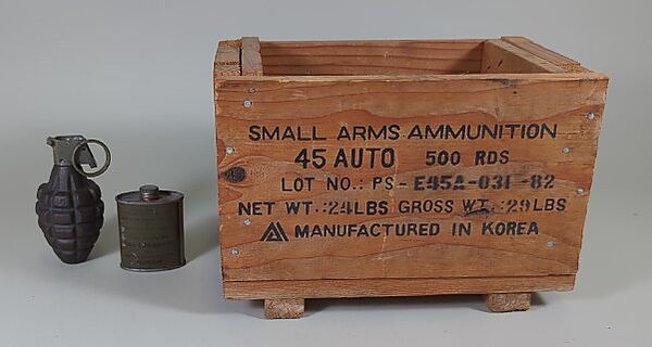 Inert Mk 2 Grenade, Empty WWII Rifle Bore Cleaner Tin, And 45 Auto Ammo Crate