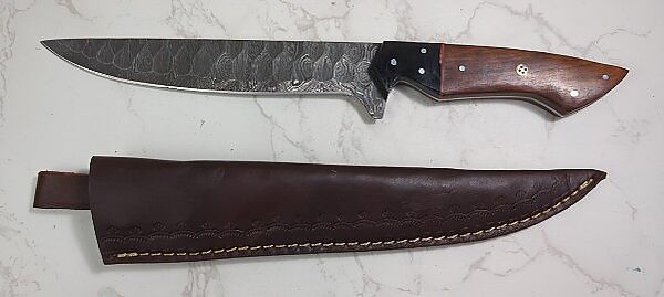 Custom Damascus Fixed Blade Knife, 7" Straight Back Blade, In Tooled Leather Sheath