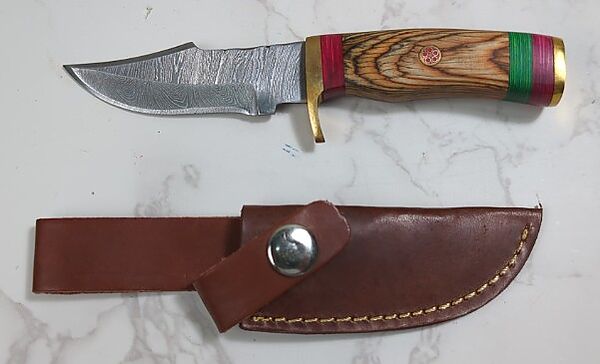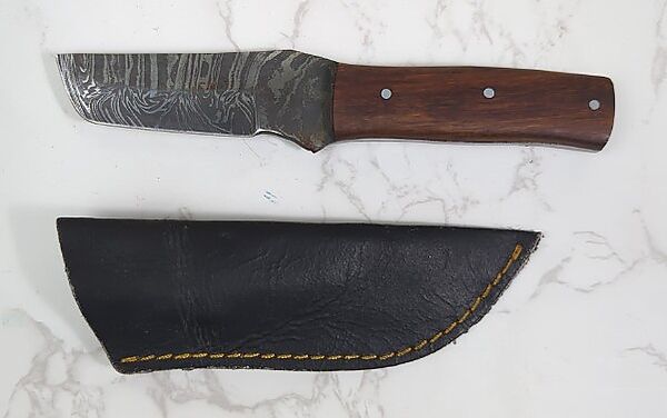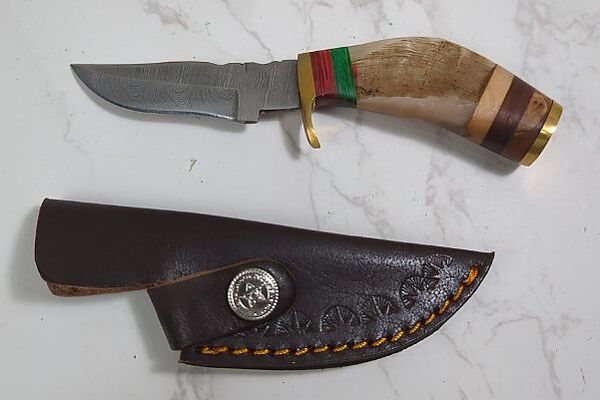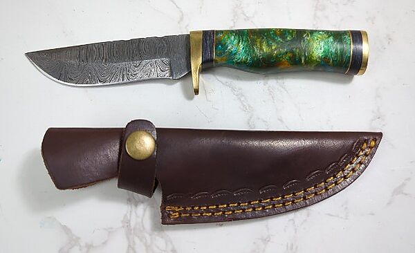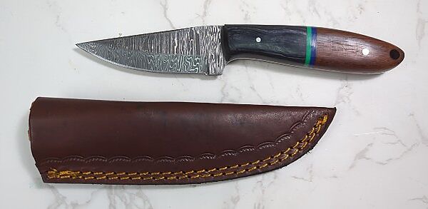 Custom Damascus Fixed Blade Knife, 4" Blade, In Leather Sheath