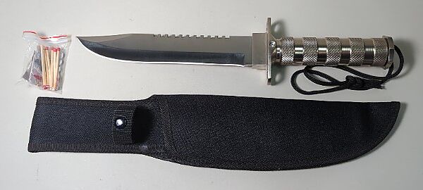 Clip Point Survival Knife With Sawback, Handle Holds Compass, Matches, Hooks, And More, 8" Blade, In Nylon Sheath