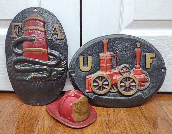 Cast Iron Fire Insurance Wall Plaques & Helmet