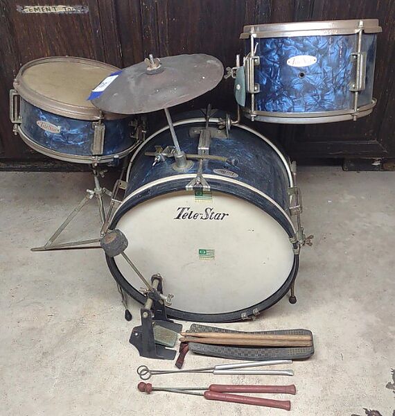 Vintage Tele Star Children's Beginner Drum Set. Bass drum pedal detached from beater.